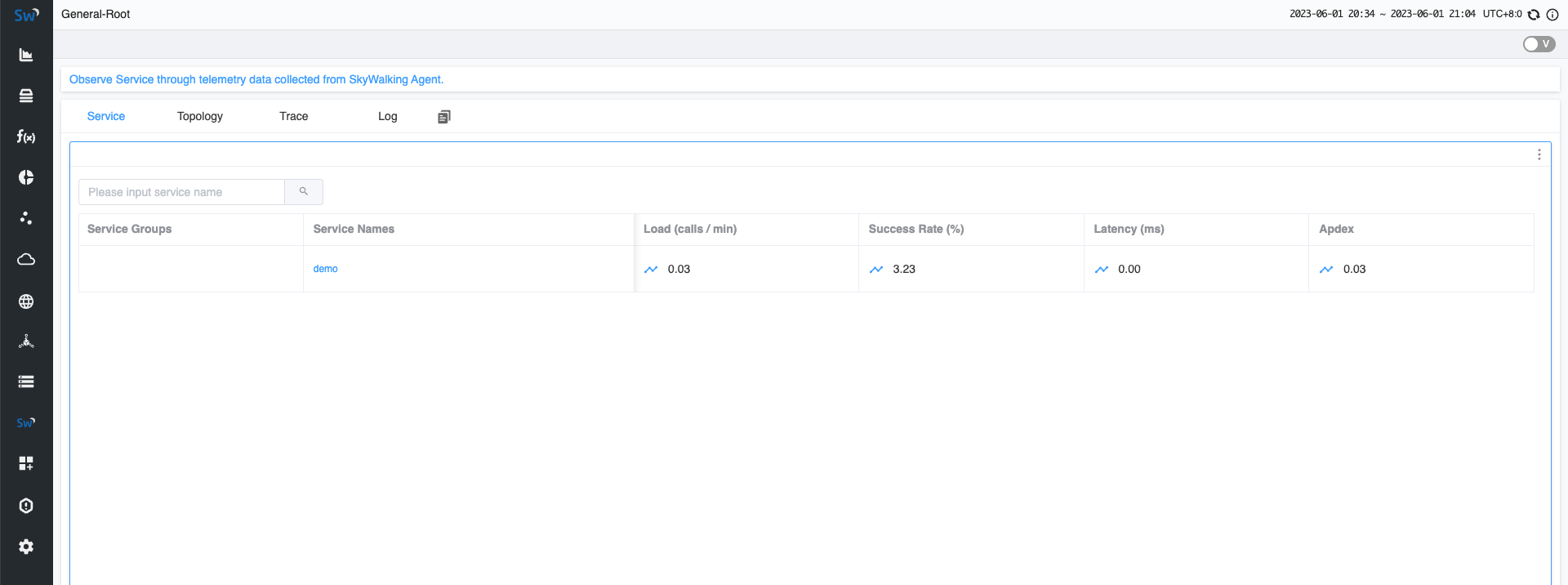 几秒钟后,重新访问 http://localhost:8080 的 SkyWalking UI。能够在主页上看到部署的 demo 服务。